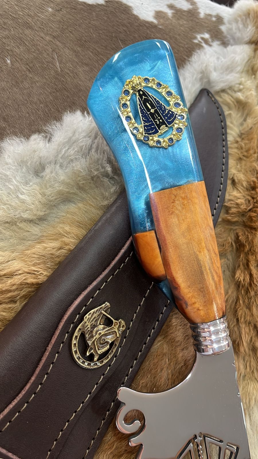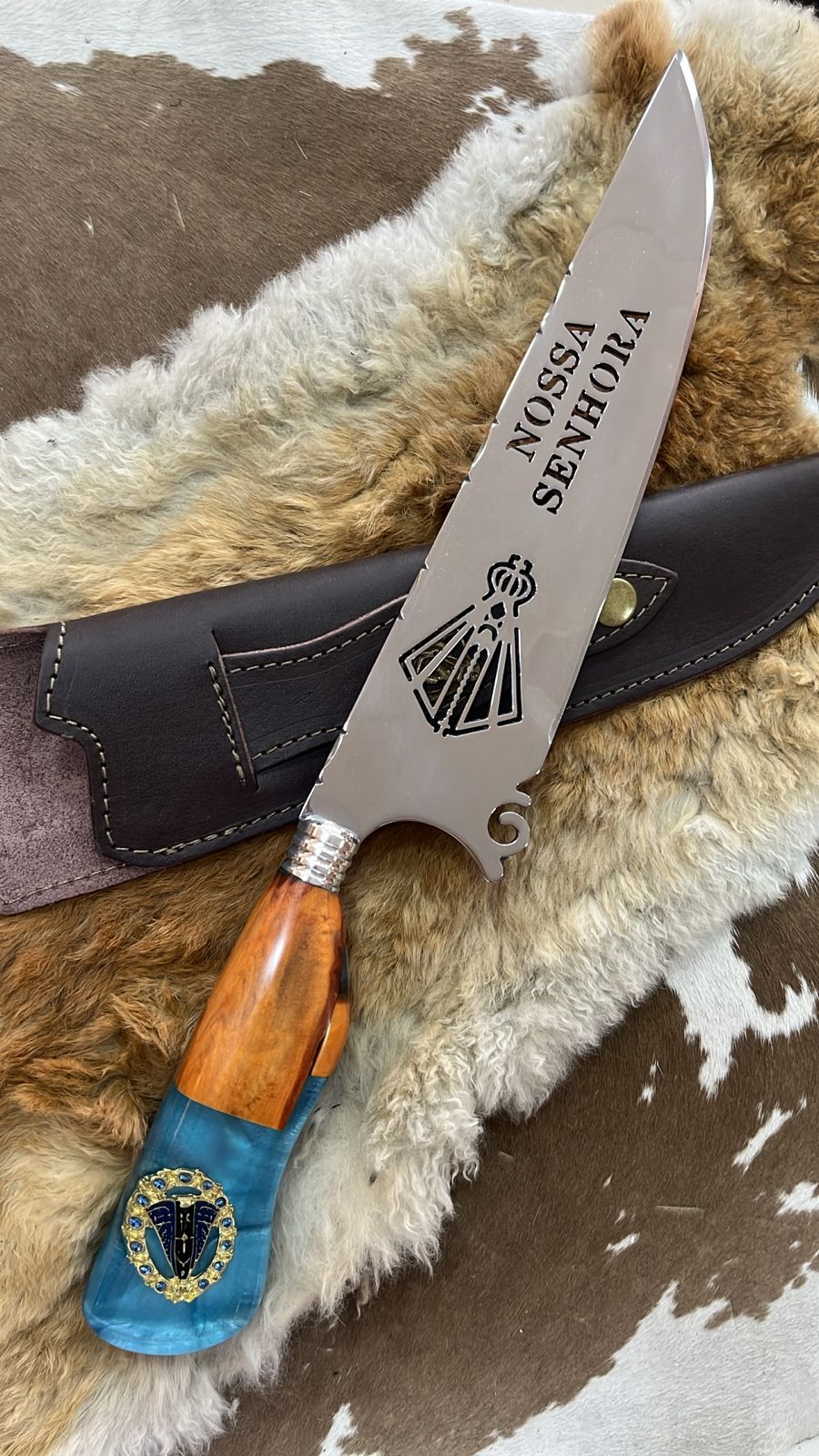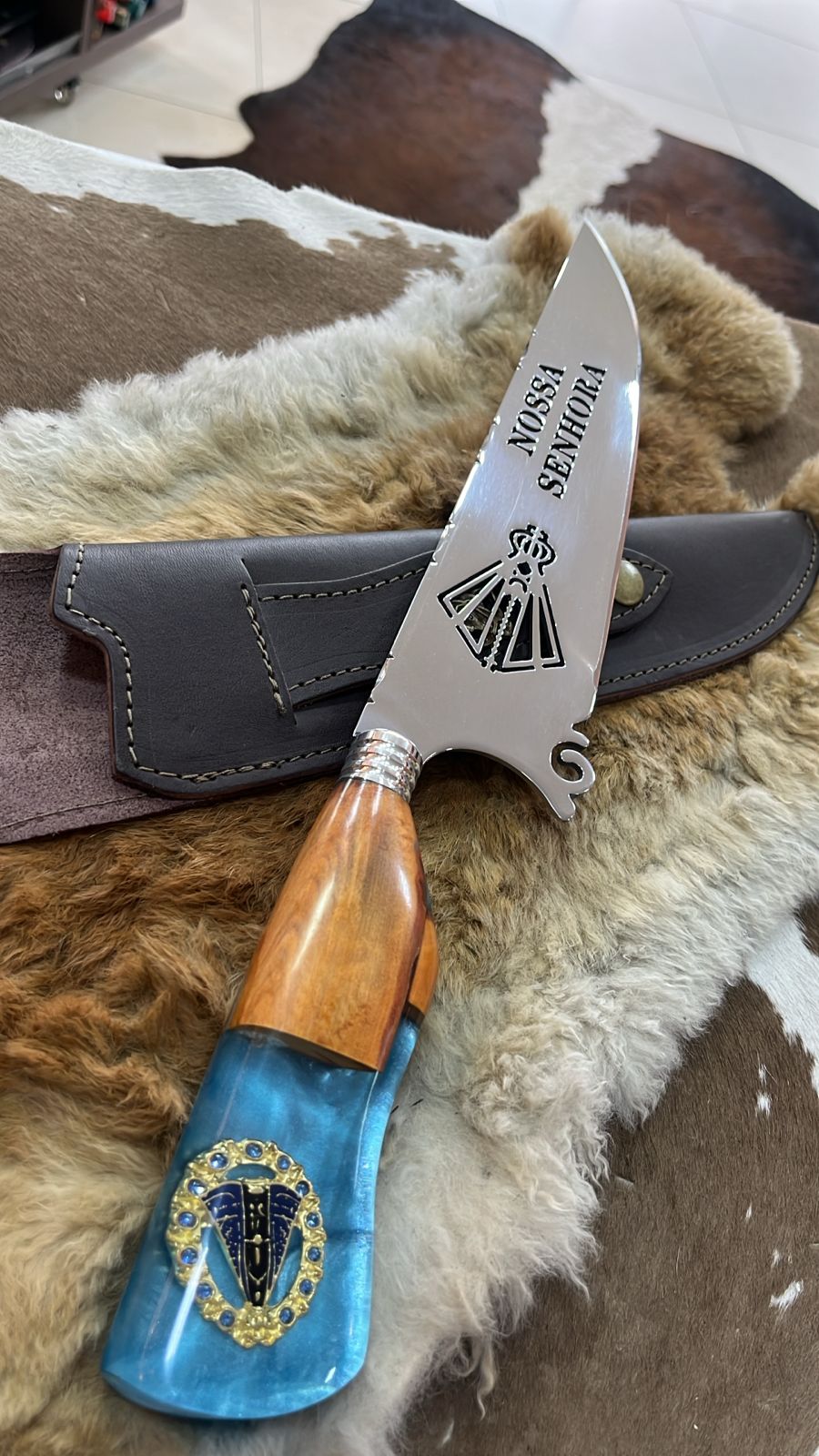 Cada milímetro da Faca Nossa Senhora Aparecida é feito com precisão artesanal. O cabo misto de madeira nobre e resina azul translúcida cria um contraste marcante, enquanto o símbolo dourado da Santa traz significado e exclusividade.